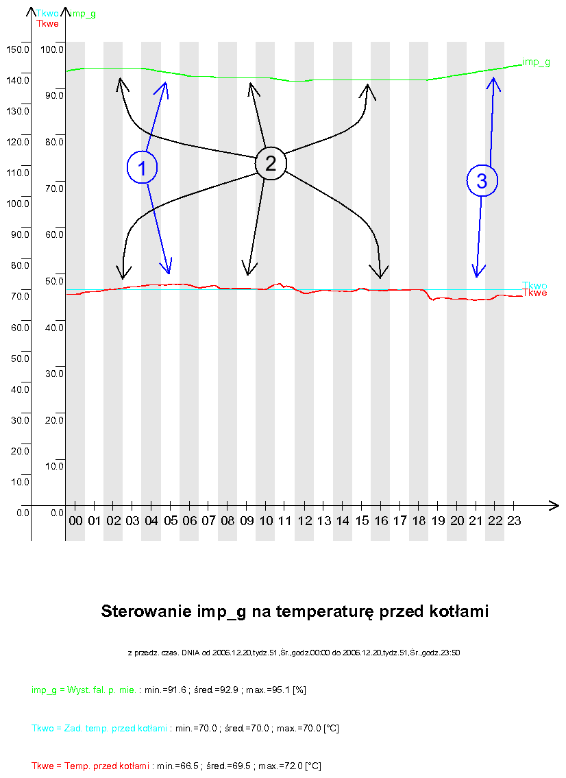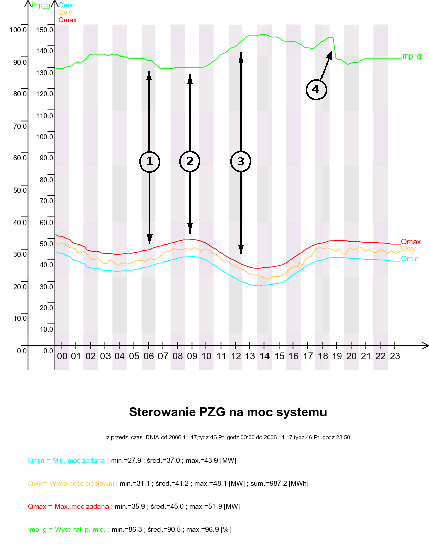 W sytuacji oznaczonej 1 wzrasta zapotrzebowanie na moc ciepłowni (widełki mocy "podnoszą się"), a więc wysterowanie pomp zmieszania gorącego imp_g spada, co powoduje wzrost mocy ciepłowni. W sytuacji oznaczonej 2 zapotrzebowanie na moc stabilizuje się i wysterowanie pomp imp_g pozostaje stałe. Sytuacja oznaczona 3 jest odwrotna do 1 - widełki mocy "opadają", wysterowanie falownika imp_g rośnie, co powoduje spadek wydajności ciepłowni. Gwałtowna zmiana wysterowania falownika imp_g w momencie oznaczonym jako 4 została spowodowana przełączeniem regulatora w pracę w synchronizacji przez obsługę bez wcześniejszego wyregulowania wysterowania falownika przy pomocy zadajnika.