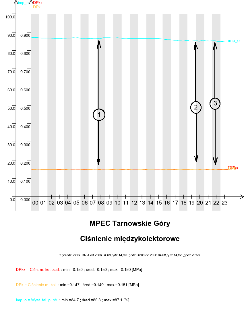 W punkcie 1 zaznaczono sytuację, gdy aktualna wartość ciśnienia międzykolektorowego WR-25 (funkcja 31)) jest większa od wartości zadanej (funkcja 30)) +0,003MPa. W tym przypadku następuje zmniejszenie wysterowania pompy przewałowej (funkcja 06). W punkcie 2 oznaczono sytuację, gdy aktualna wartość ciśnienia międzykolektorowego WR-25funkcja 31) jest mniejsza od wartości zadanej funkcja 30) -0,003MPa. W tym przypadku następuje zwiększenie wysterowania pompy przewałowej funkcja 06). W punkcie 3 zaznaczono sytuację, gdy aktualna wartość ciśnienia międzykolektorowego WR-25 (funkcja 31) jest równa z tolerancją +/-0,003 MPa wartości zadanej (funkcja 30). W tym przypadku pompa przewałowa (funkcja 06) nie zmienia swojego wysterowania.